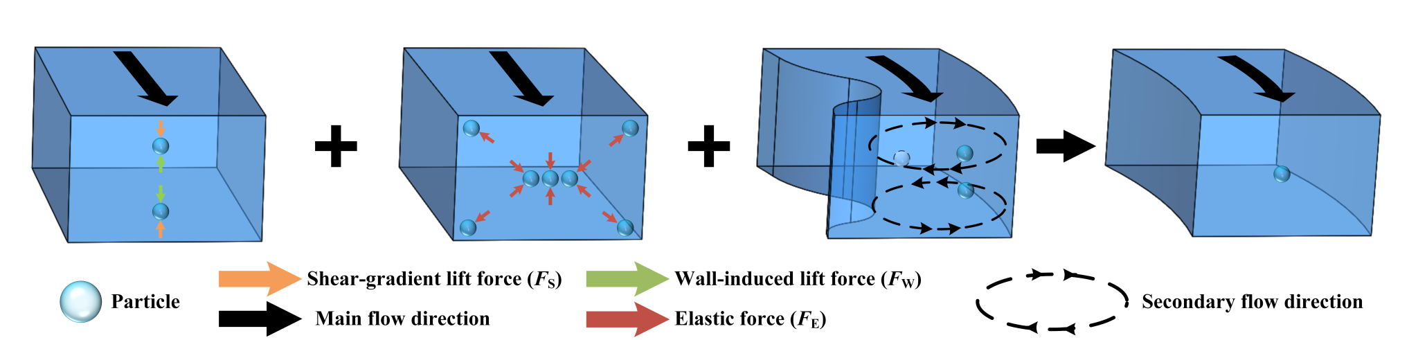 图1 流体“惯性-粘弹性-增强型二次流”协同效应示意图